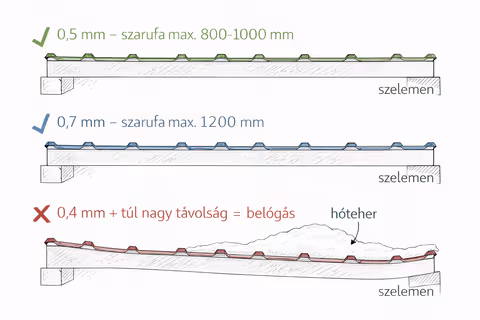 A szelementávolság határozza meg, hogy a lemez elbírja-e a terhelést - havat, szelet, a saját súlyát. Ha túl nagy a távolság, a lemez belóg, hóban meghajlik, és onnan már nincs visszaút.